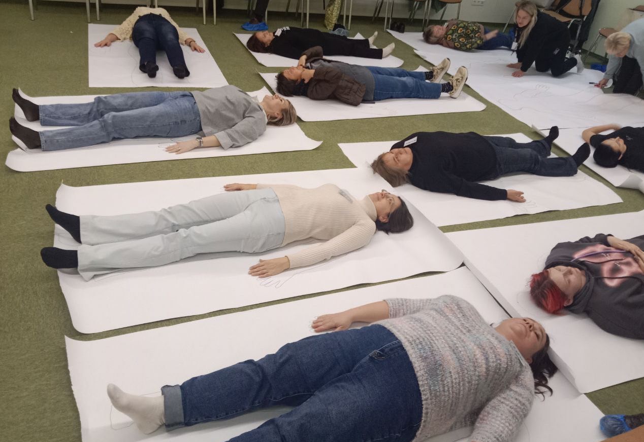 Со стороны может показаться, что взрослые люди просто рисуют. Но в процессе начинается глубокое, невербальное исследование себя. Сначала слушатели, обводя контуры своих тел, словно очерчивают границы собственного внутреннего мира. В воздухе витает сосредоточенная тишина, прерываемая лишь шелестом бумаги. Наступает ключевой этап — для наполнения контура прочувствовать своё внутреннее состояние в разных частях тела. Слушатели закрывают глаза, следуя инструкции преподавателя, погружаясь в свои ощущения. Это момент внутреннего фокуса, когда внимание поворачивается внутрь. «Что вы чувствуете в груди? Какого цвета ваша усталость?» — эти вопросы не остаются риторическими. По тому, как слушатели затем берут в руки пастель, видна их решимость выразить нечто сокровенное. И вот на белых листах начинают оживать внутренние ландшафты. Вот один из слушателей с силой закрашивает область плеч густым коричневым цветом — видимое воплощение напряжения и груза ответственности. В другом углу рождается удивительный образ: слушательница рисует в области сердца не красную мускулистую ткань, а распускающийся цветок лотоса. Это метафора, которая пришла из глубин подсознания.