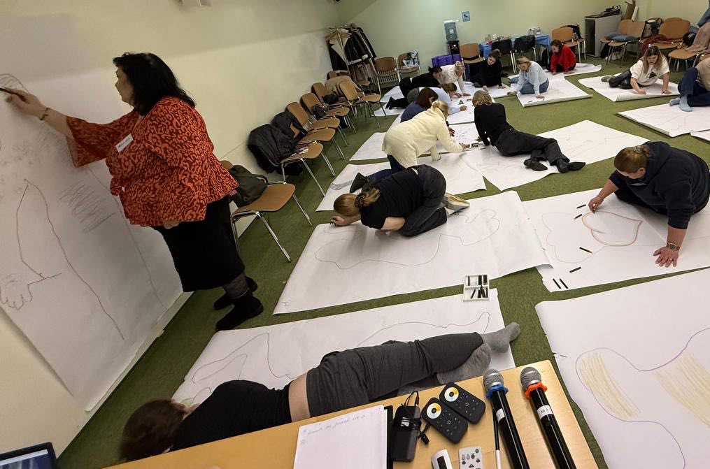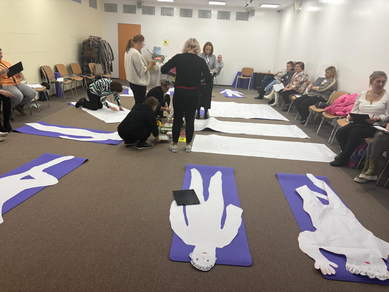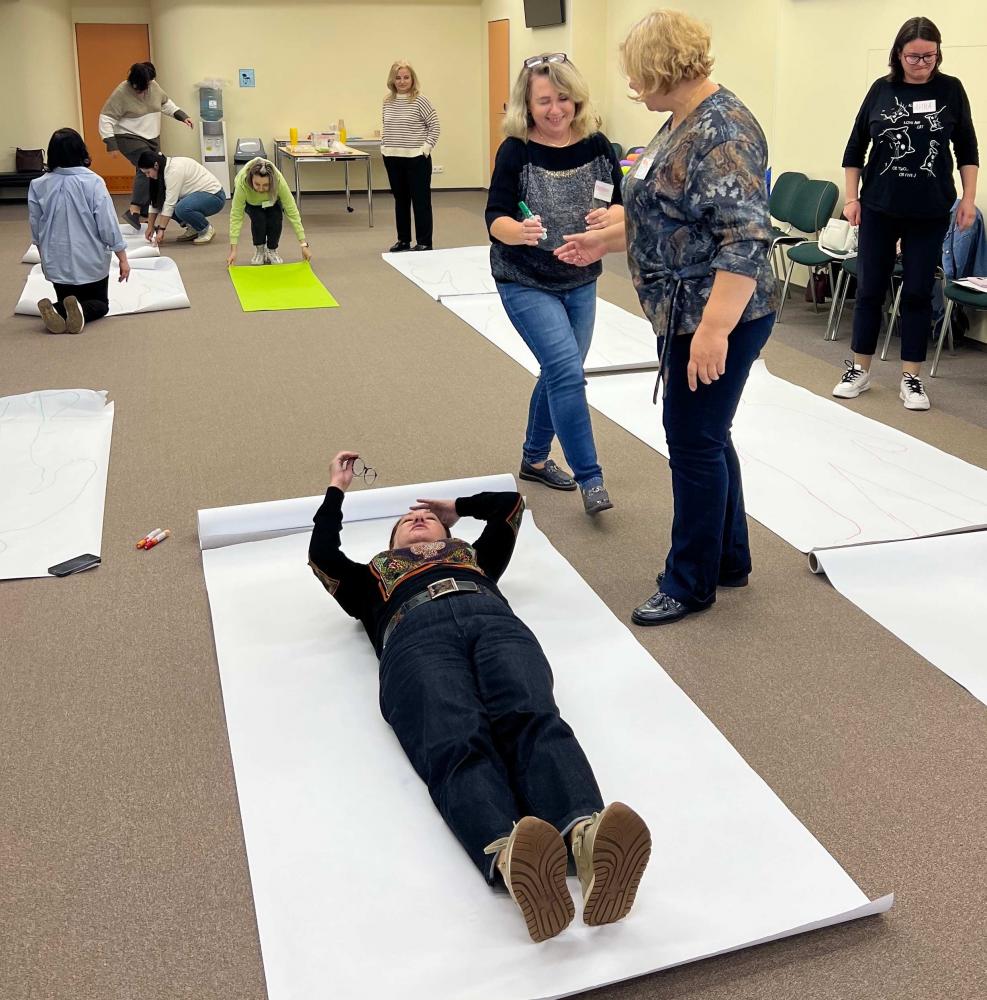 Группа слушателей «Школы психологического развития» готова приступить к уникальному практикуму. Сегодня в работе — метод экспрессивной арт-терапии Натали Роджерс, упражнение «Контур тела».