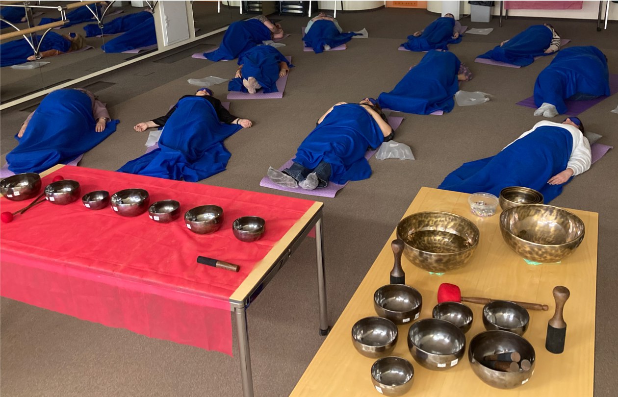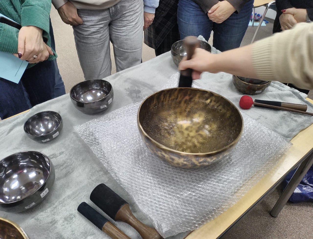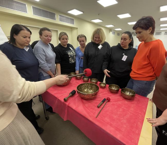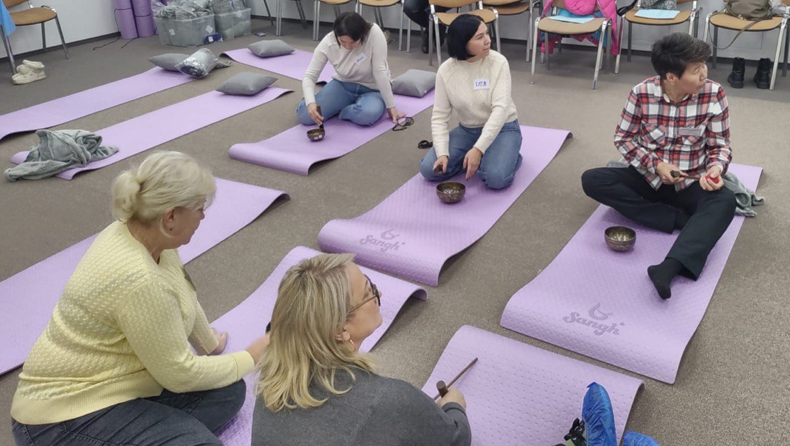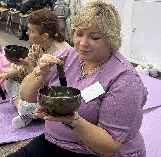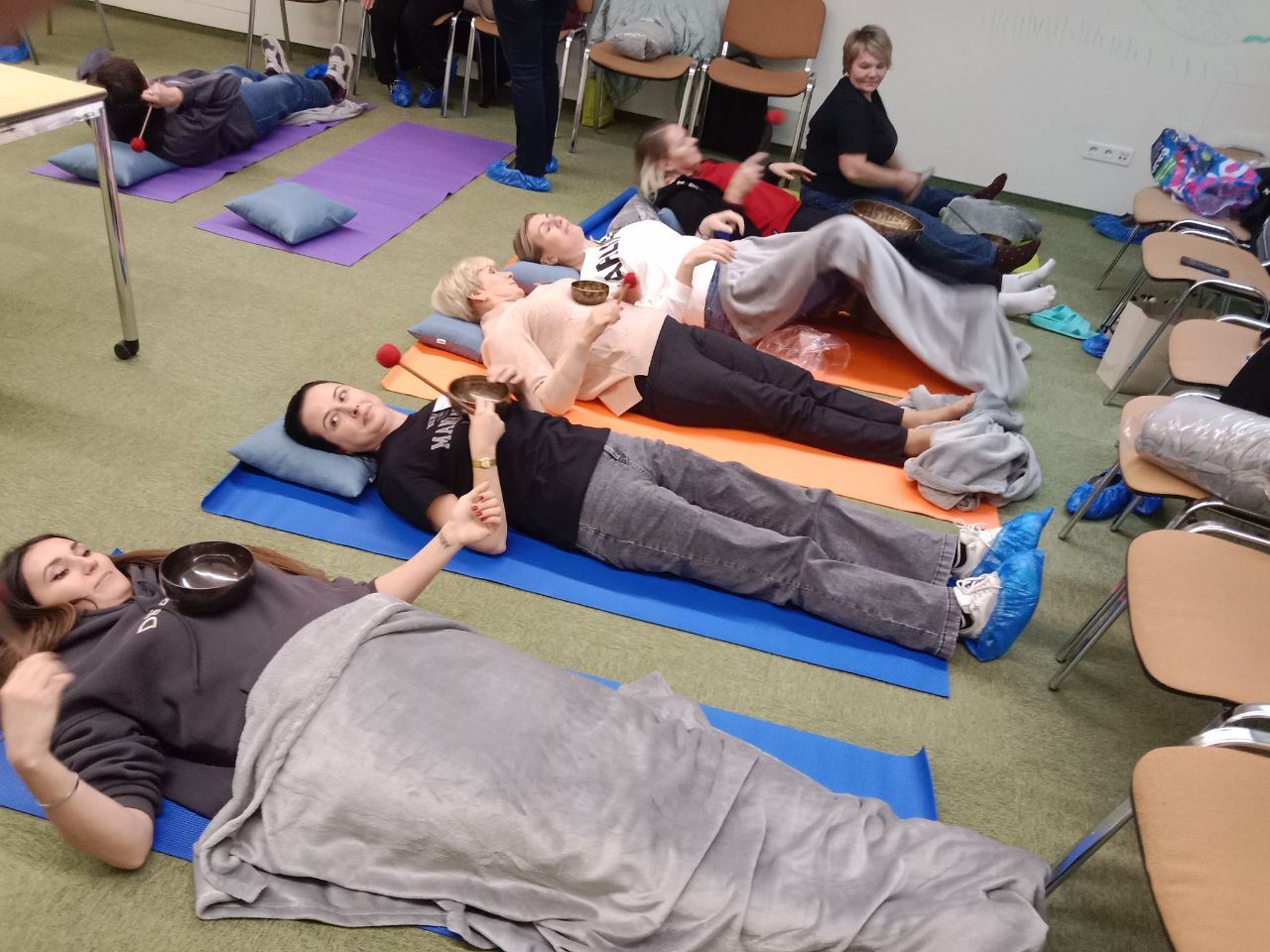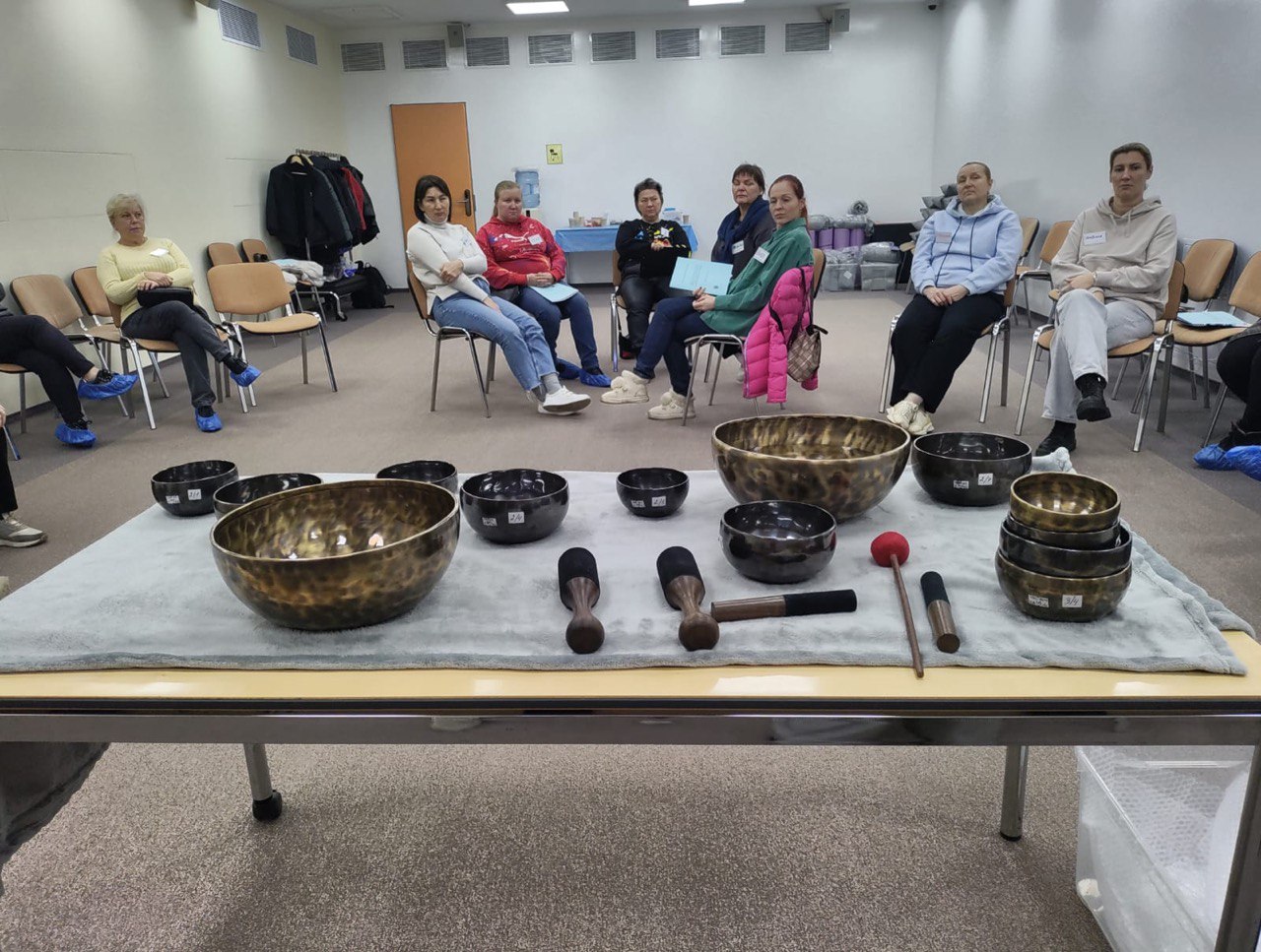 В рамках образовательного процесса «Школы психологического развития» проводятся занятия с применением тибетских поющих чаш как эффективного инструмента звукотерапии. Занятия были организованы с соблюдением принципов постепенного погружения в практику. Особое внимание уделялось созданию соответствующей атмосферы: использование ковриков и пледов способствовало быстрому переходу слушателей в состояние готовности к релаксации. Основным методическим инструментом выступил набор из семи тибетских чаш, подобранных согласно принципам звуковой терапии. Каждая чаша соответствует определенной музыкальной ноте и энергетическому центру, что позволяет осуществлять направленное воздействие на психофизиологическое состояние слушателей.